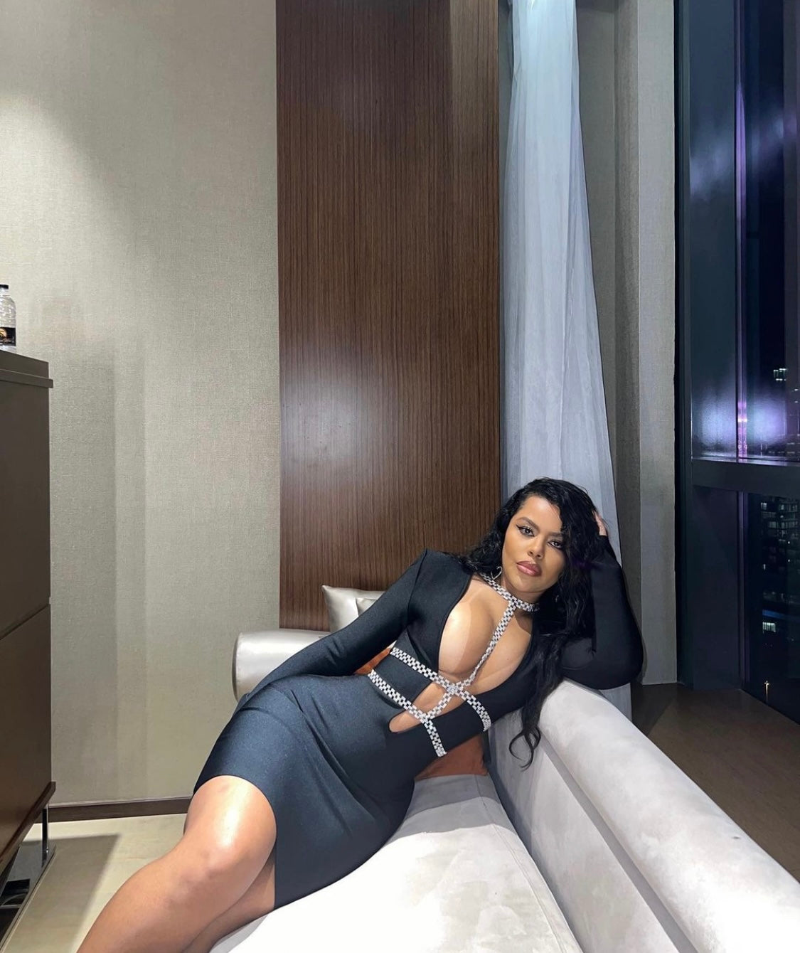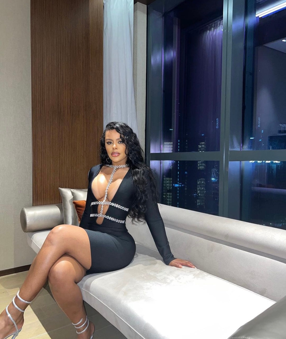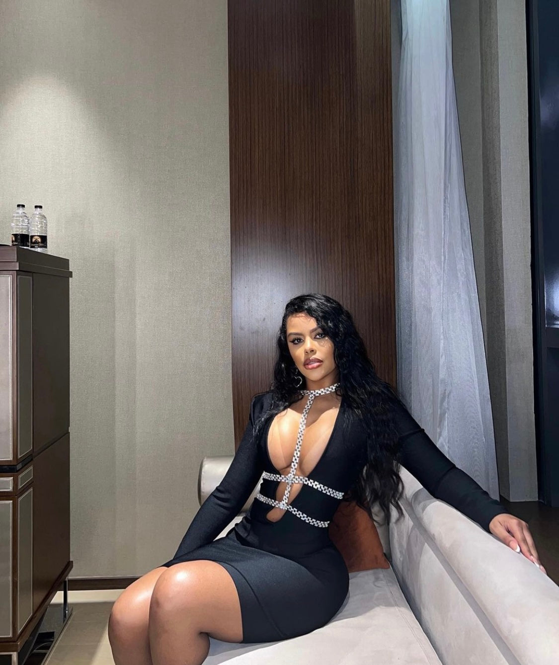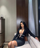 Show off your fashion forward sense and wear this glamorous style THE GODDESS Mini Bandage Dress for your social occasion! Heavy quality luxury stretchy bandage fabric shapes this little dress that features long sleeve, deep v neck and mini-length hem. Diamonate chains from the neck to the waist giving you a mesmerizing detailing that sparkles effortlessly. Pair with a pair of sparklyΒ heels and earrings and head out for the night!