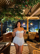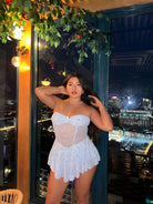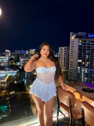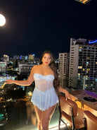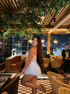 Our AFRODITA blue sky mini dress would likely feature a soft that evokes a sense of calm and openness, reminiscent of a clear, sunny day. With a flattering silhouette that flows gently into a skirt that hits above the knees in the shape of a steering wheel and with a flirtatious touch.